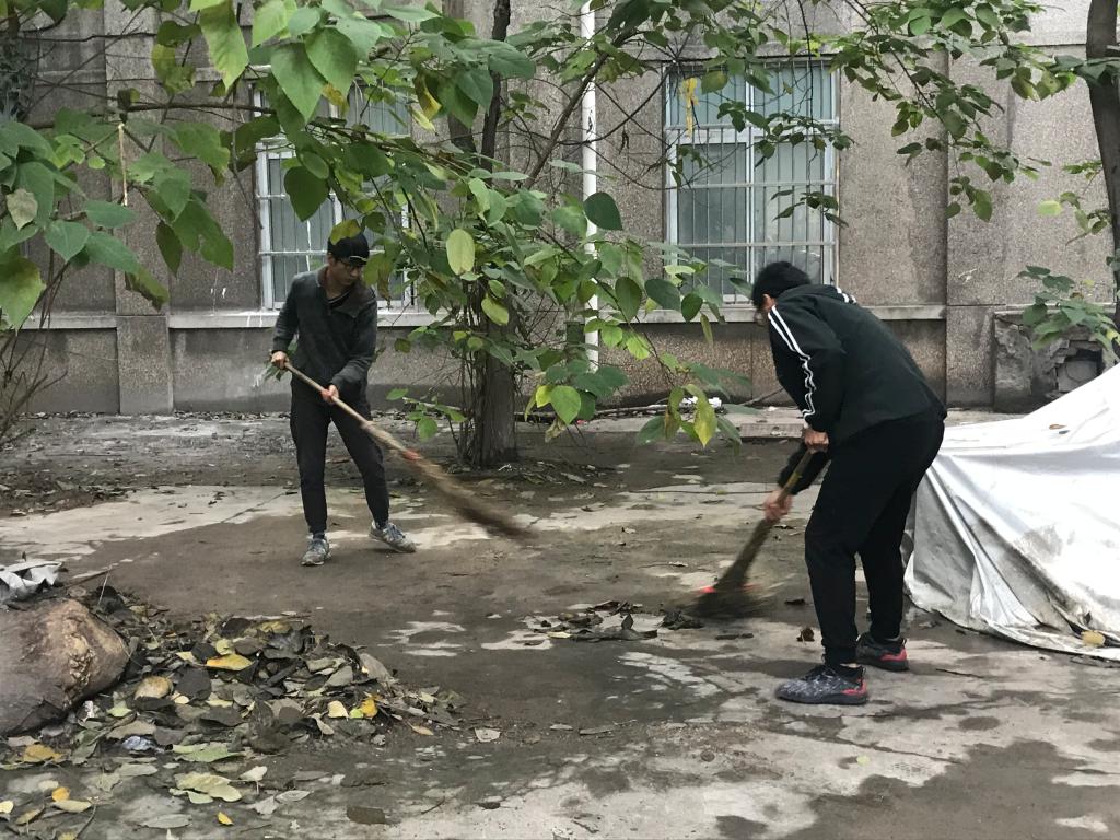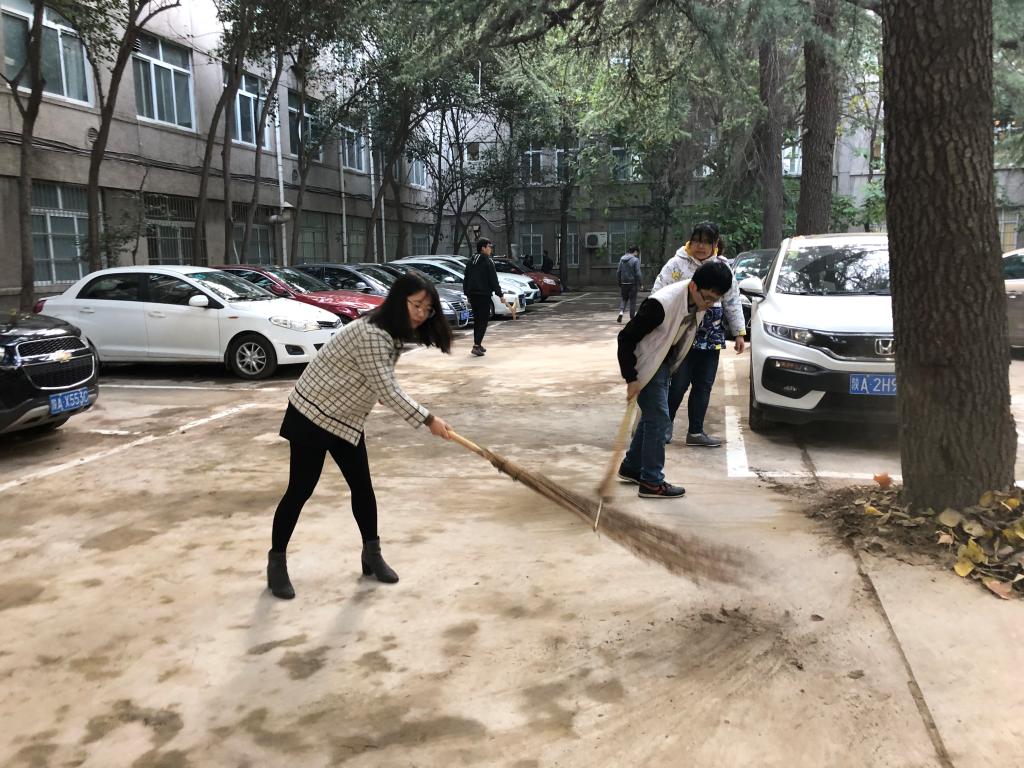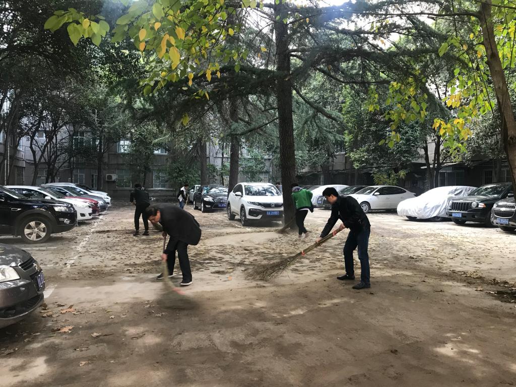 11月8日下午,公司党总支书记张茂林和执行经理贺辛亥带领师生一起在金花校区原环化楼和机电楼中间的停车场开展扫落叶义务劳动。