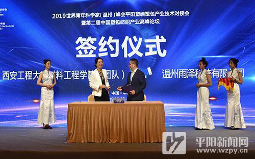 高峰论坛上,刘畅老师与温州雨泽科技有限公司签订了战略合作协议。随后,公司副经理苏晓磊教授做了相关报告,介绍了公司近年来在无纺布领域的研究进展。与会专家学者还进行了高峰对话。在此环节中,公司副书记刘畅老师就推动平阳塑编塑包纺织产业市场拓展、产业转型升级等提出了柔性人才引进、建立产学研基地、加大源头产品研发投入等独到的见解。