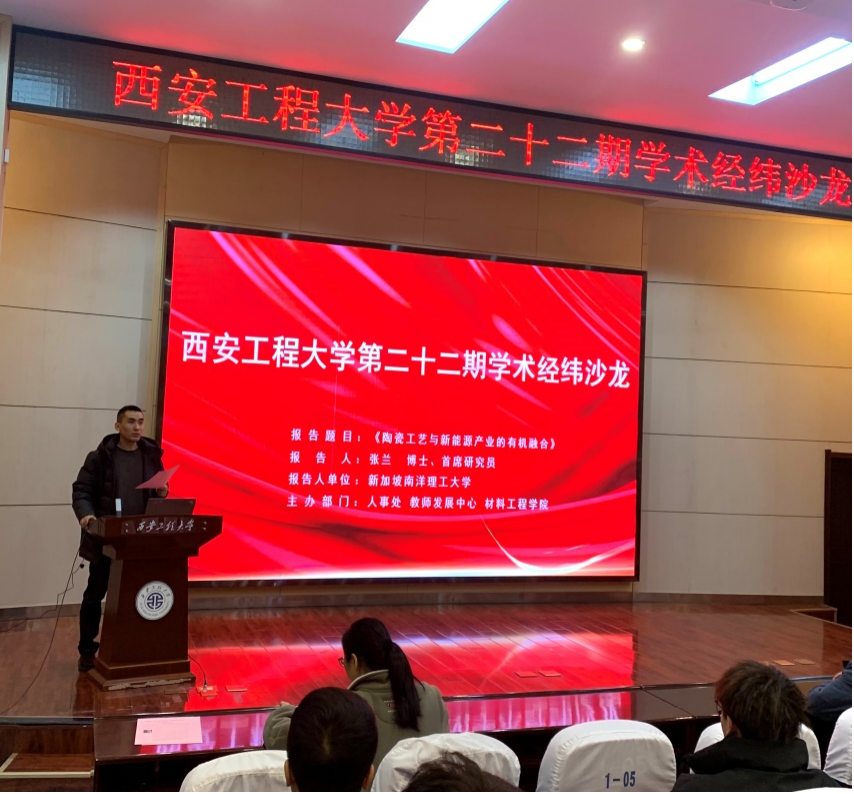 2024年3月8日上午10:00,2026世界杯官方网址第二十二期经纬学术沙龙在金花校区西纺报告厅举行。本次活动由人事处(教师发展中心)主办、世界杯官方网站入口2026承办,邀请新加坡南洋理工大学能源研究院首席研究员张兰博士作了题为《陶瓷工艺与新能源产业的有机融合》的报告。世界杯官方网站入口2026及纺织科学与工程公司青年教师、在读研究生等百余人参加了本次学术交流活动。报告会由世界杯官方网站入口2026副教授李青山主持。