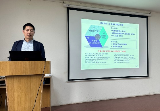 报告会开始前,巫云龙对陈广波教授的到访表示衷心的感谢和热烈欢迎,并对陈教授做了简单介绍。陈教授结合自己在国外七年的科研经历,系统地介绍了单原子催化剂的设计和精准合成。采用实验和理论相结合,通过合理设计催化剂材料中的活性位点,调控催化活性位点的可接触性和其本征活性,实现高效、低成本的催化电解水制备氢气和氧气,为实现“碳达峰”和“碳中和”提供有效路径。