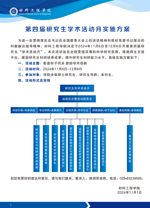 接着副书记刘畅介绍了本次学术活动月的具体安排,在本次学术活动月中将有专家学术报告、研究生高水平科研学术成果展、材料微结构摄影作品展,创新团队学术沙龙、研究生材子论坛、西迁博物馆参观等系列活动。这些活动涵盖不同的主题和领域,包括纺织复合材料、金属基功能复合材料、柔性功能材料、纳米涂层等多个方面。研究生们不仅有机会听取校内外的专家学者的精彩报告,还可以就个人感兴趣的研究方向及论文成果与青年教师和优秀研究生同学进行深入的交流和探讨,分享自己的研究成果和科研收获。
