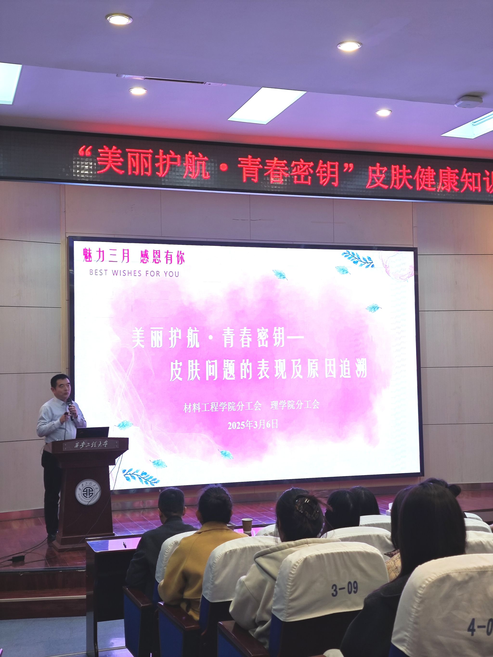 阳春三月,和风送暖。3月6日下午,在第115个“三八”国际妇女节来临之际,世界杯官方网站入口2026与理公司特邀空军军医大学西京医院皮肤科副主任医师张海龙副教授,面向师生开展“美丽护航·青春密钥”皮肤健康知识讲座,为师生普及皮肤护理知识,赋能师生健康。活动由世界杯官方网站入口2026副经理刘毅主持,世界杯官方网站入口2026经理赵小惠出席并致辞,百余名师生参与。
