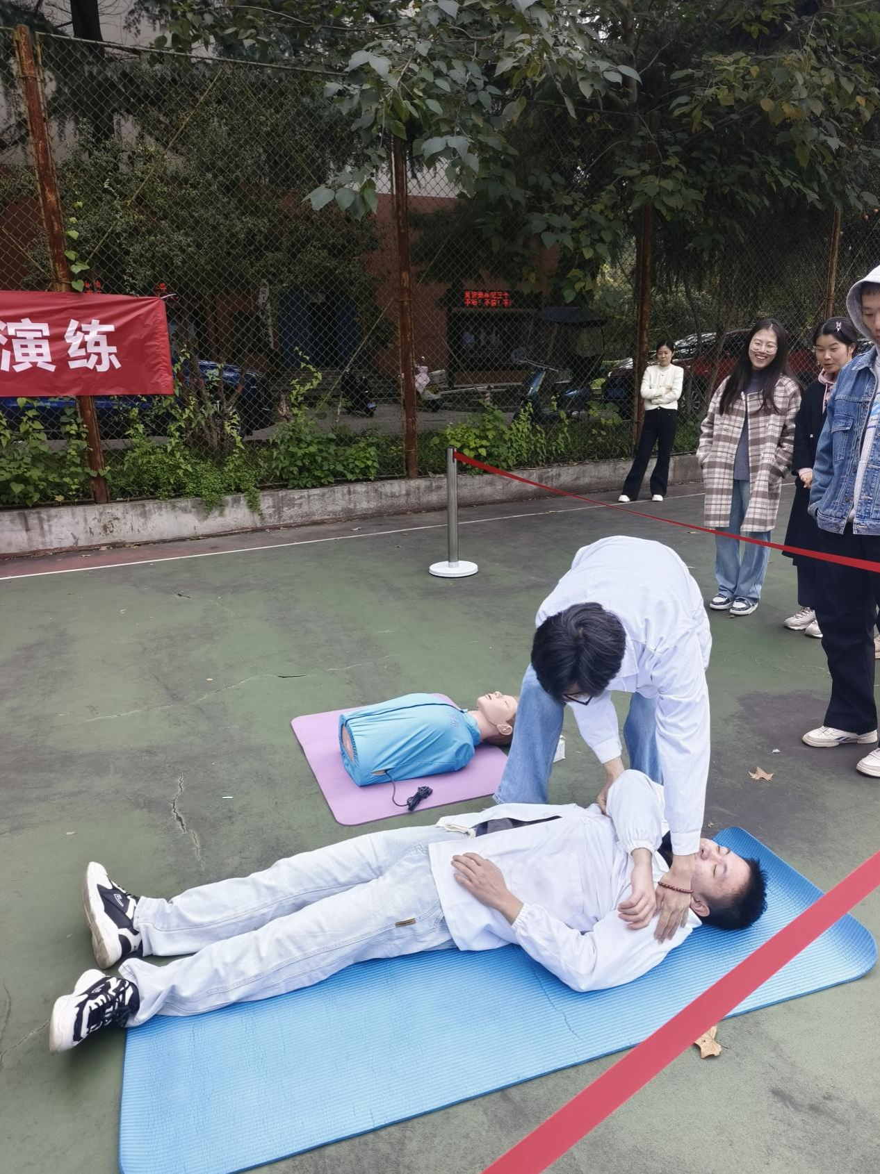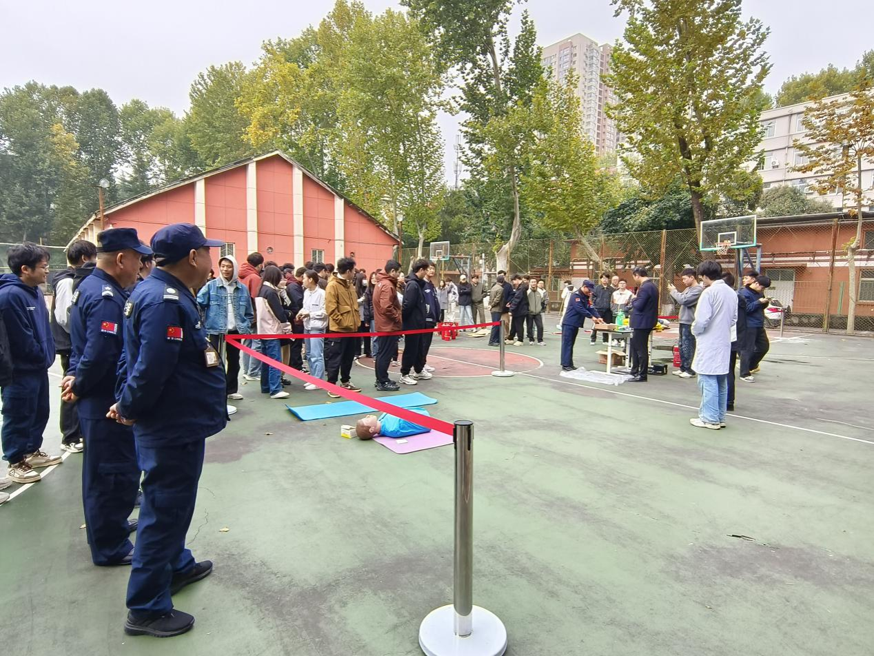 应急救护场景里,参演人员针对实验室可能出现的人员受伤情况,进行了心肺复苏等急救技能的演示与实践,让师生们掌握了关键的生命救护知识。