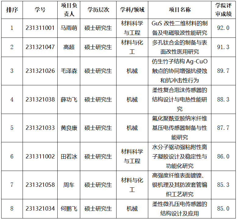 2025年度 材料工程 公司研究生创新基金项目拟推荐名单汇总表
