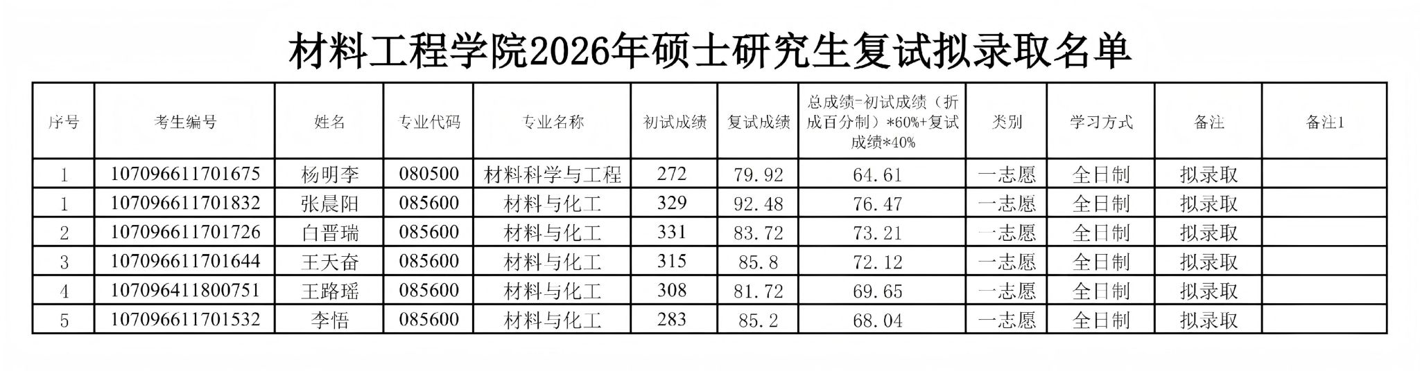 根据公司《关于做好公司2026年硕士研究生招生复试录取工作的通知》及《材料工程工程公司2026年硕士研究生调剂复试录取工作实施细则》,公司已完成2026年硕士研究生第一志愿复试工作。经公司研究生复试录取工作领导小组审核,现将拟录取考生名单予以公示,公示期3天。若有异议,请于公示期内实名向公司或公司研招办反映。