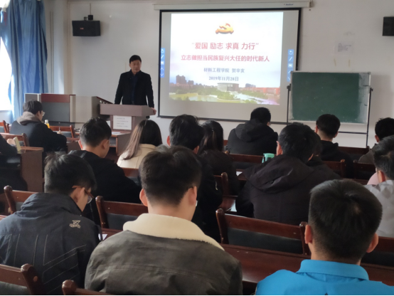 1128下午经理贺辛亥爱国、励志、求真、力行立志做担当民族复兴大任的时代新人为题为2016级材料成型及控制工程01员工讲授思政教育课首先为同学们解读了“爱国、励志、求真、力行这八个字的内涵,在授课中勉励同学们要做到,一、坚定理想信念永跟党走;二、提升能力素质把学业放在首位;三、主动作为、勇于担当奋斗的青春最美丽;四、博览群书、实践创新要培养国际视野。最后,经理为同学们介绍了材料工程公司的基本情况和科研团队情况,希望同学们扎实学好专业知识,立志做担当民族复兴大任的时代新人。