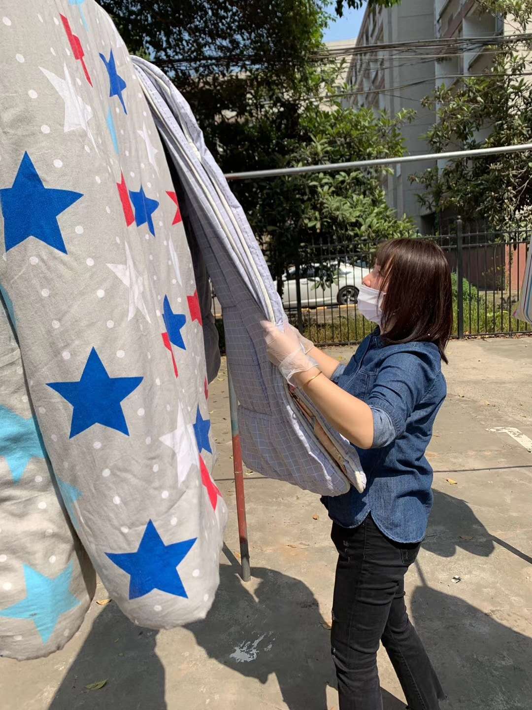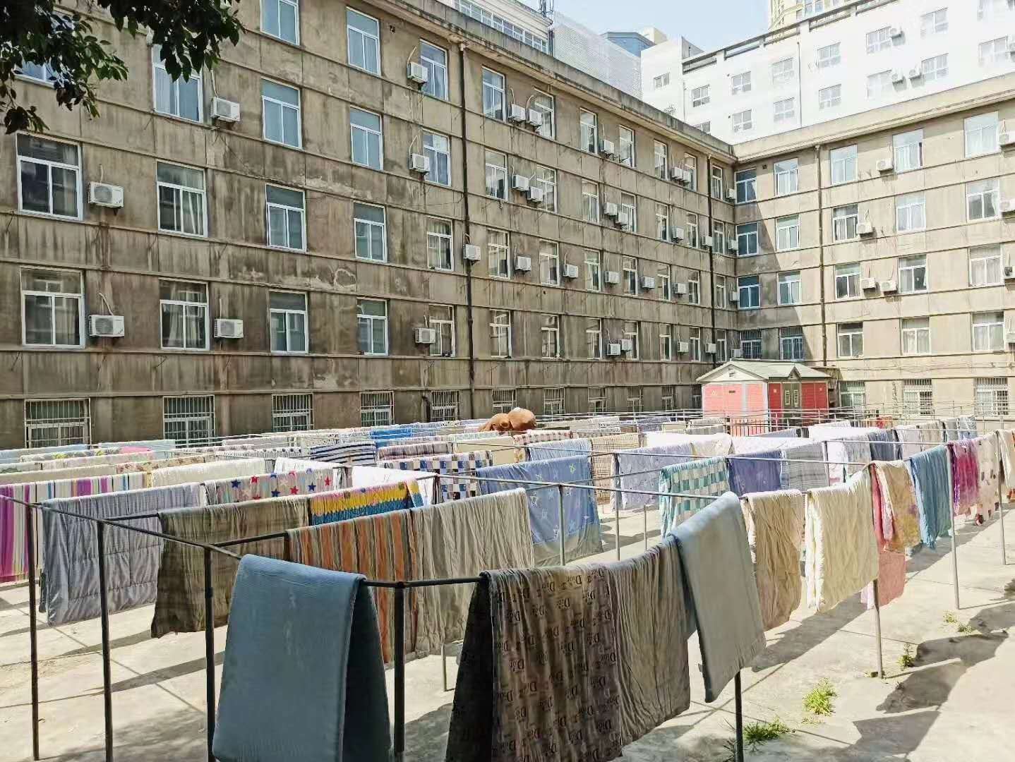 同时,在2016级毕业员工即将返校之际,为了让同学们返校时能够有一个干净、卫生的宿舍环境,在后勤集团宿管科的大力支持下,公司组织老师分批、错时地前往员工宿舍将员工的被褥拿到校园公共区域进行晾晒,老师们利用夹子和便利贴对每一床被褥进行了认真标记和署名,保证准确无误地将员工被褥“从哪里来,还哪里去”。他们为自己的员工辛勤付出,一趟趟地上楼下楼,一趟趟地搬运整理,体现出了浓浓的关怀之情。