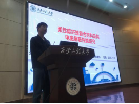 18级研究生丁元清简要介绍了柔性碳纤维复合材料及其电磁屏蔽性能研究,并为大家展示了一种电磁屏蔽性能好,电磁波透射率低的电磁屏蔽材料。