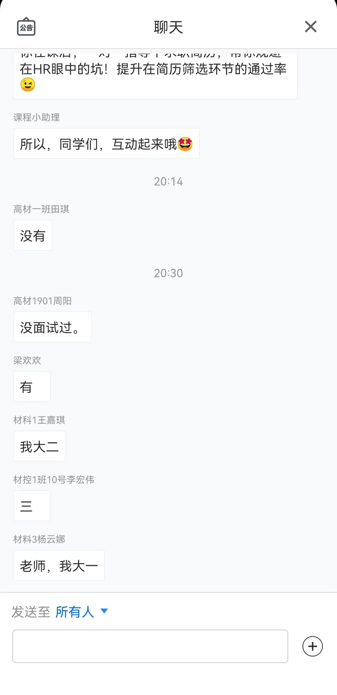 最后,刘毅老师建议同学们在求职阶段做好充分准备,敢于表现,积极争取,充分彰显材料学子的创新实践能力和社会责任担当,在未来,不负韶华,脚踏实地,走出属于自己的精彩人生!