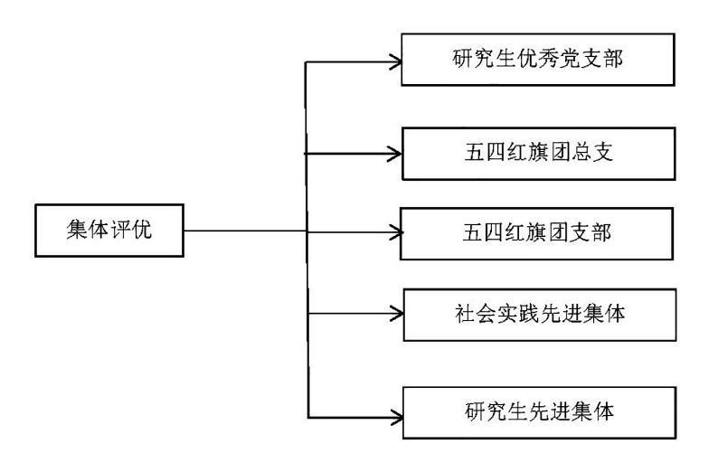 第五条 研究生集体荣誉称号授予基层优秀党、团、班集体,含研究生先进集体、优秀研究生党支部、五四红旗团总支、五四红旗团支部四个奖项,如图2所示。