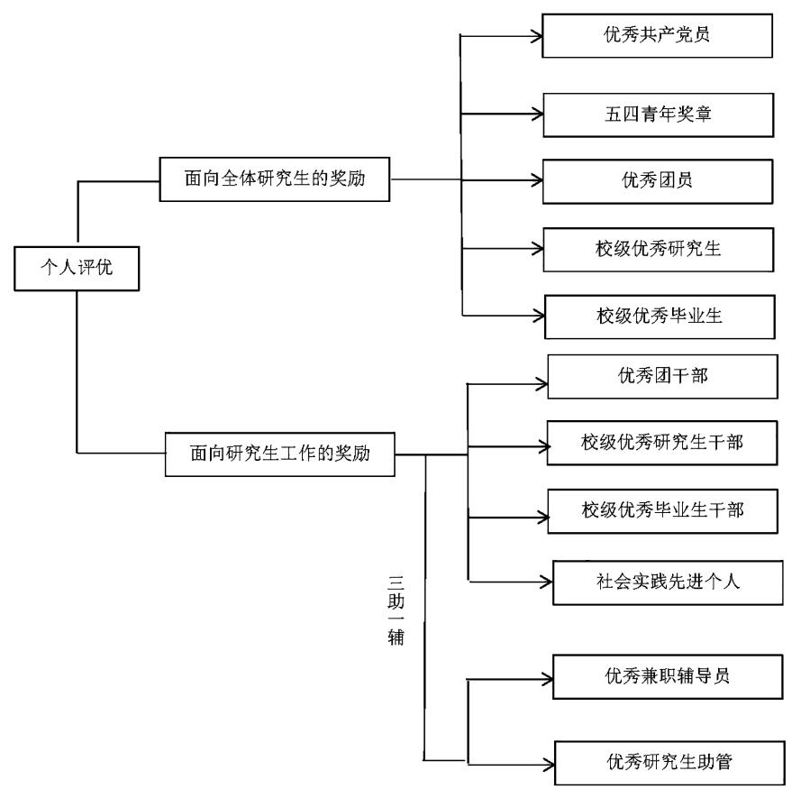 第四条 研究生个人荣誉称号分为面向研究生个人和面向研究生在校内各类工作方面的奖项设置,如图1所示。